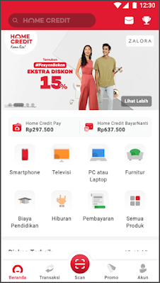Sepanjang jalan aku berfikir sambil melihat sekeliling, dan seperti ditunjukan jalan keluar, aku melihat salah satu booth yang mencolok diantara banyaknya booth elektronik. Booth tersebut sangat mencolok karena dominan dengan warna merah menyala serta merupakan booth finnancial satu-satunya diantara booth elektronik yang ada. Yap! Booth Home Credit, Seorang petugas sedang sibuk menyapa dan melayani beberapa pelanggan. Dari tulisan dan logo yang ada di baju petugas itu, aku tau banget kalau booth itu memang milik PT Home Credit Indonesia, sebuah perusahaan pembiayaan yang memberi pinjaman pada pelanggan yang ingin memiliki berbagai barang kebutuhan mulai dari furniture sampai dengan elektronik.